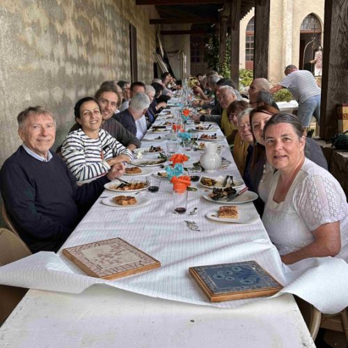 des sessions studieuses dans la salle polyvalente de Fanjeaux et des repas pris en commun dont un cassoulet mémorable dégusté dans le jardin de l'hotellerie du couvent de la Sainte-Famille, des "après colloque" qui ajoutent à la convivialité des rencontres estivales de Fanjeaux.